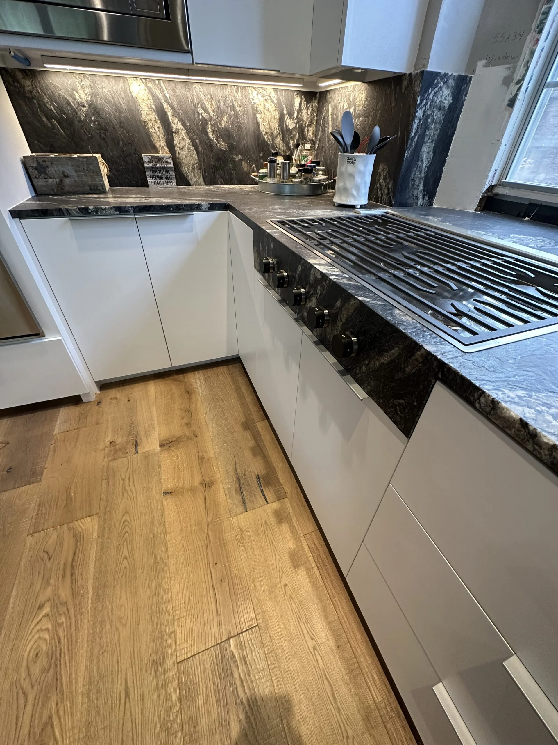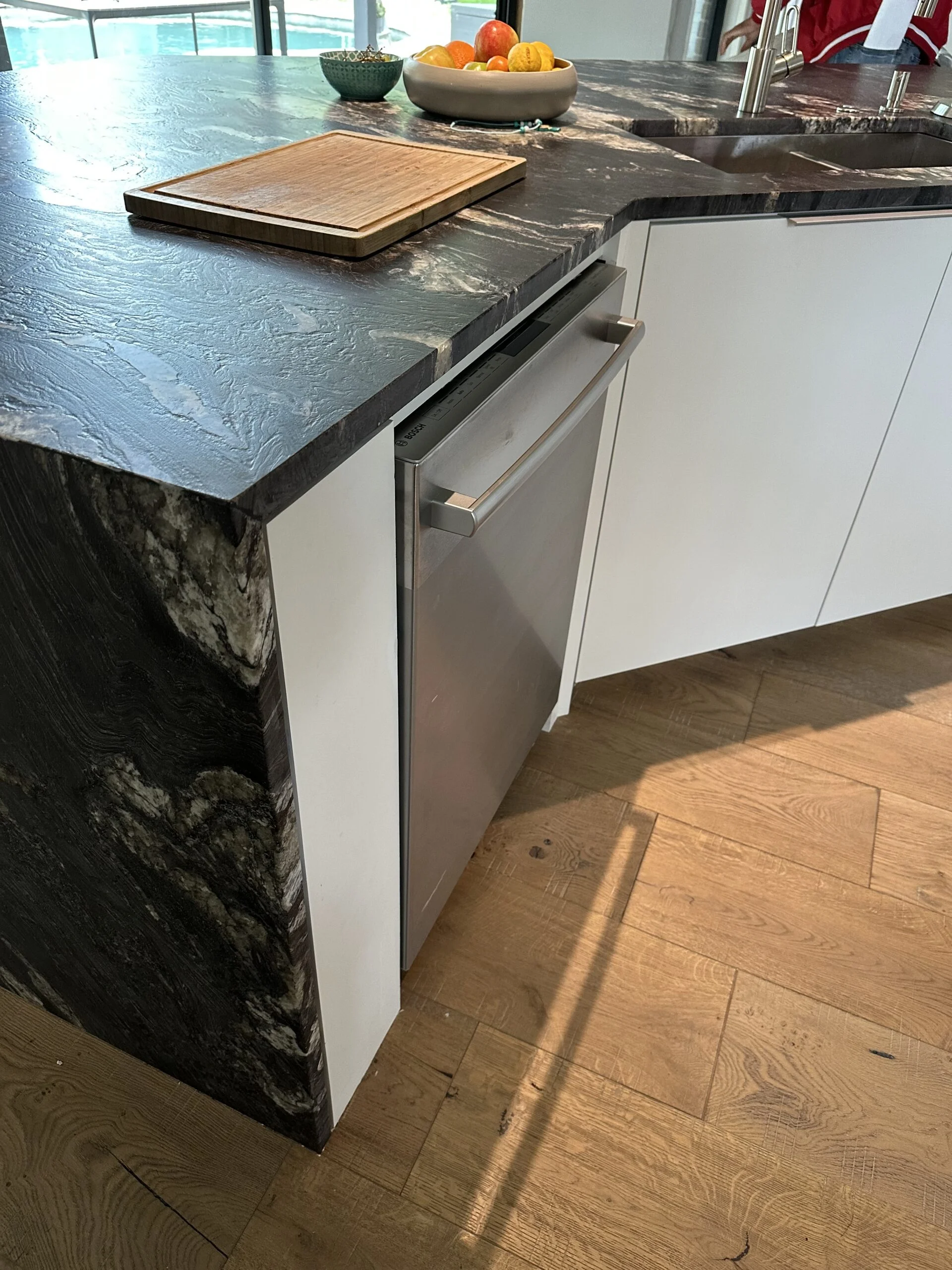 This lavish kitchen renovation is the envy of any homeowner, featuring a stunning marble-top waterfall island that instantly becomes the centerpiece of the space. The sleek, modern design is complemented by high-end finishes and carefully selected materials throughout.